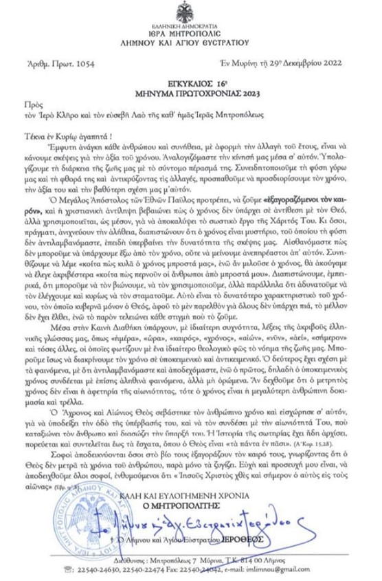 Το μήνυμά του για το Νέο Έτος εξέδωσε ο Σεβαμσιώτατος Μητροπολίτης Λήμνου και Αγίου Ευστρατίου κ. Ιερόθεος.