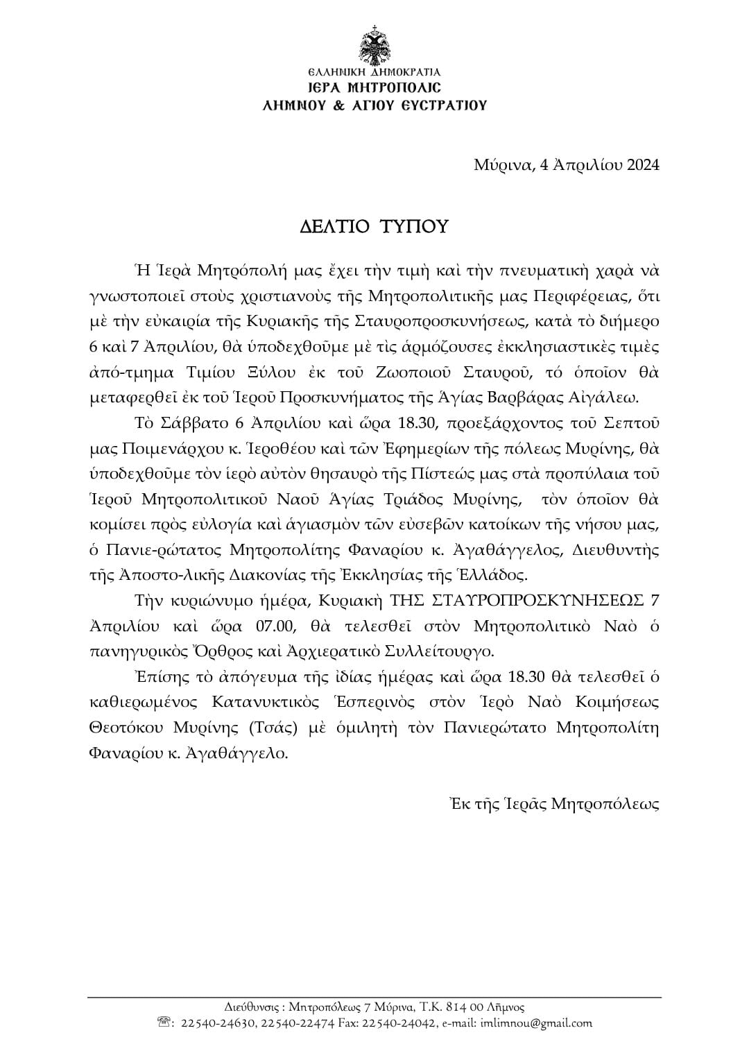 Η Ιερά Μητρόπολη Λήμνου και Αγίου Ευστρατίου ανακοινώνει στους χριστιανούς της Μητροπολιτικής Περιφέρειας ότι, με την ευκαιρία της Κυριακής της Σταυροπροσκυνήσεως, κατά το διήμερο 6 και 7 Απριλίου, θα υποδεχθεί με τις αρμόζουσες εκκλησιαστικές τιμές απότμημα Τιμίου Ξύλου εκ του Ζωοποιού Σταυρού, το οποίο θα μεταφερθεί εκ του Ιερού Προσκυνήματος της Αγίας Βαρβάρας Αιγάλεω.