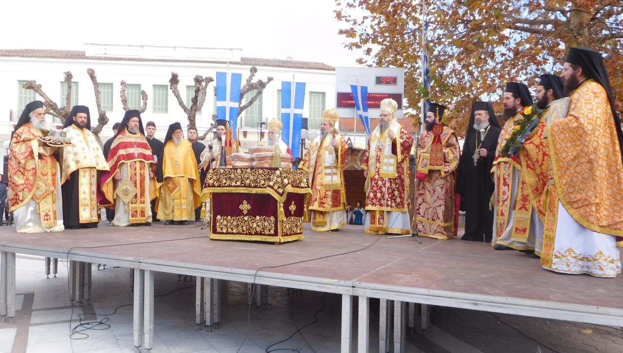 Οι λατρευτικές εκδηλώσεις προς τιμήν του Αγίου ενδόξου Οσιομάρτυρος Γεδεών του εν Τυρνάβω συνεχίστηκαν και σήμερα με το τρισαρχιερατικό συλλείτουργο, προεξάρχοντος του Σεβασμιωτάτου Μητροπολίτου Δράμας κ. Παύλου, του Σεβασμιωτάτου Μητροπολίτου Γρεβενών κ. Δαβίδ και του σεπτού μας Ποιμενάρχου κ. Ιερωνύμου. Παρόντες στη θεία Λειτουργία οι Άρχοντες του τόπου και ο ευσεβής λαός της πόλεως του Τυρνάβου. Ο Μητροπολίτης Δράμας μίλησε για το μαρτύριο του Αγίου τονίζοντας ότι όλοι μας οφείλουμε να μιμηθούμε τον νεομάρτυρα και να προσπαθήσουμε να είμασθε αληθινοί Χριστιανοί όχι μόνο στα λόγια αλλά και στα έργα. Ακολούθησε η λιτανεία της χαριτοβρύτου Κάρας και της εικόνας του Αγίου στους δρόμους της πόλεως ενώ στην κεντρική πλατεία αναπέμφθηκε δέηση και αρτοκλασία. Στη σύντομη προσλαλιά του ο κ. Ιερώνυμος κάλεσε άπαντας να προσεύχονται στον Άγιο, ο οποίος ανταποδίδει την τιμή σε όλους όσοι τον τιμούν ειλικρινώς και παρουσίασε στο χριστεπώνυμο πλήρωμα τους δύο νέους εφημερίους του Μητροπολιτικού Ναού της Παναγίας Φανερωμένης Τυρνάβου, τον Αρχιερατικό επίτροπο π. Βησσαρίωνα Μπλέτσα και τον π. Γεδεών Μαντά, ευχόμενος εις αμφοτέρους να εργαστούν για το καλό της τοπικής μας Εκκλησίας.