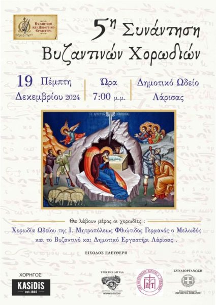 Την Πέμπτη 19 Δεκεμβρίου 2024, και ώρα 7.00 μ.μ., στο Δημοτικό Ωδείο Λάρισας θα πραγματοποιηθεί η 5η Συνάντηση χορωδιών Βυζαντινής και Εκκλησιαστικής Μουσικής με την συμμετοχή των Χορωδιών: