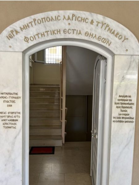 Ο αγιασμός των εγκαινίων του ανακαινισμένου κτιρίου, για την έναρξη λειτουργίας του ως Οικοτροφείου, επί των οδών Κυθήρων και Πρεβέζης, τελέστηκε από τον Σεβασμιώτατο Μητροπολίτη Λαρίσης και Τυρνάβου κ. Ιερώνυμο, παρουσία των αρχόντων της πόλεως και πλήθους πιστών.