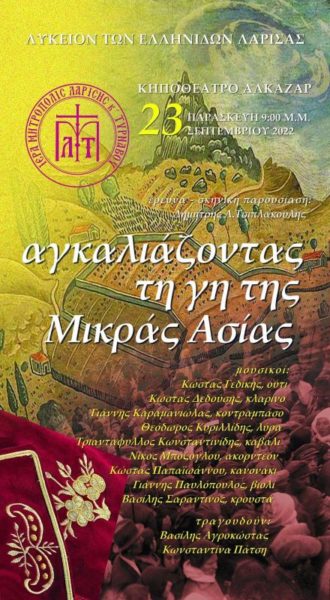 Καθώς φέτος συμπληρώνεται ένας αιώνας από τον ξεριζωμό της ελληνικής παρουσίας στη Μικρά Ασία και την Ανατολική Θράκη, η Ιερά Μητρόπολη Λαρίσης και Τυρνάβου και το Λύκειον των Ελληνίδων Λάρισας, την Παρασκευή 23 Σεπτεμβρίου 2022 και ώρα 21:00, στο Κηποθέατρο Αλκαζάρ, θα ζωντανέψουν μνήμες της Μικράς Ασίας ακουμπώντας στο τραύμα του ξεριζωμού του 1922.