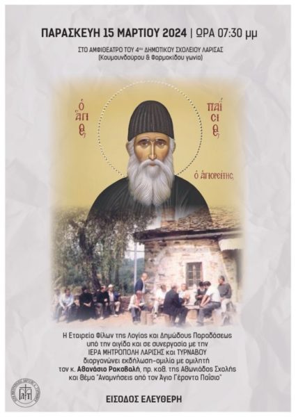 Η Ιερά Μητρόπολις Λαρίσης και Τυρνάβου σε συνεργασία με την Εταιρεία Φίλων της Λογίας και Δημώδους Παραδόσεως διοργανώνει την Παρασκευή 15 Μαρτίου, και ώρα 7:30 μ.μ., στο αμφιθέατρο του 4 ου Δημοτικού Σχολείου Λάρισας, εκδήλωση-ομιλία, με θέμα: «Αναμνήσεις από τον Γέροντα Παΐσιο», με ομιλητή τον κ. Αθανάσιο Ρακοβαλή.
