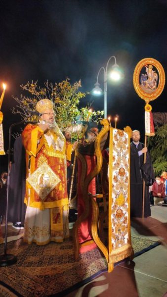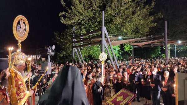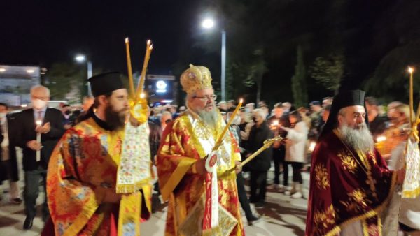 Πλήθος πιστών παρακολούθησαν την Αναστάσιμη Παννυχίδα και ακολούθως την Αναστάσιμη Θεία Λειτουργία στον Μητροπολιτικό Ιερό Ναό του Αγίου Αχιλλίου στη Λάρισα, ιερουργούντος του Σεβασμιωτάτου Μητροπολίτου Λαρίσης και Τυρνάβου κ. Ιερωνύμου, παρουσία των πολιτικών και στρατιωτικών αρχών.