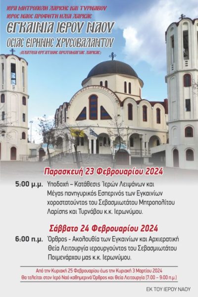22/02/2024 22/02/2024 Το Σάββατο 24 Φεβρουαρίου 2024, ο Σεβασμιώτατος Μητροπολίτης Λαρίσης και Τυρνάβου κ. Ιερώνυμος, θα τελέσει τα εγκαίνια του υπόγειου Ιερού Ναού του Προφήτη Ηλία Λαρίσης, ο οποίος είναι αφιερωμένος στην οσία Ειρήνη Χρυσοβαλάντου, σύμφωνα με το ακόλουθο πρόγραμμα: Την Παρασκευή 23 Φεβρουαρίου, στις 5:00 μ.μ., θα πραγματοποιηθεί η υποδοχή και η κατάθεση Ιερών Λειψάνων και...
