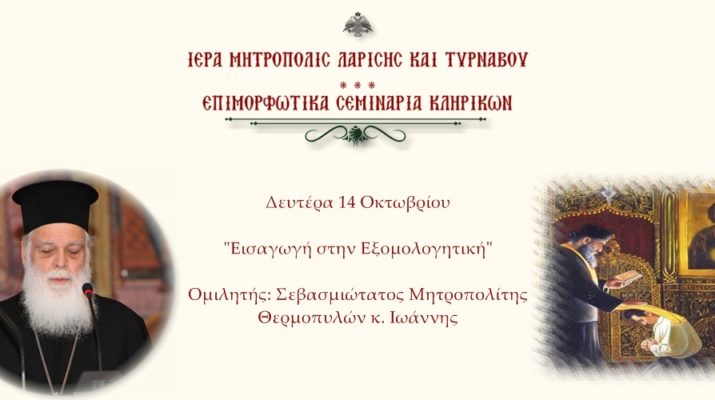 Με τις ευχές του Σεβασμιωτάτου Μητροπολίτου Λαρίσης και Τυρνάβου κ. Ιερωνύμου και σε αγαστή συνεργασία με το Ίδρυμα Ποιμαντικής Επιμόρφωσης (ΙΠΕ), πραγματοποιείται τη Δευτέρα 14 Οκτωβρίου εκπαιδευτικό Σεμινάριο με τίτλο: «Εισαγωγή στην Εξομολογητική». Θα μιλήσει ο Σεβασμιώτατος Μητροπολίτης Θερμοπυλών κ. Ιωάννης. Το ΙΠΕ είναι Επιμορφωτικό και Ερευνητικό Εκκλησιαστικό Ίδρυμα της Ιεράς Αρχιεπισκοπής Αθηνών