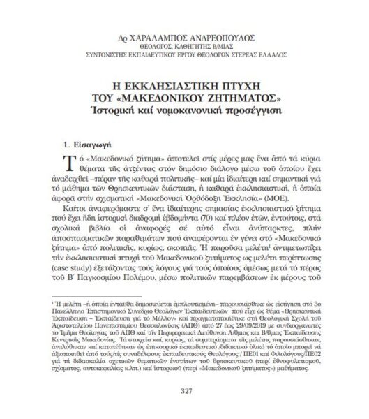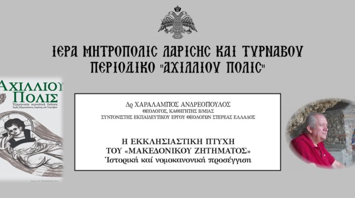 Άρθρο του Δρος Χαραλάμπους Ανδρεόπουλου, Θεολόγου, Καθηγητού Β/θμιας, Συντονιστού Εκπαιδευτικού Έργου Θεολόγων Στερεάς Ελλάδος στο περιοδικό ΑΧΙΛΛΙΟΥ ΠΟΛΙΣ της Ιεράς Μητροπόλεως Λαρίσης και Τυρνάβου υπό το θέμα: H Εκκλησιαστική Πτυχή Του «Μακεδονικού Ζητήματος».