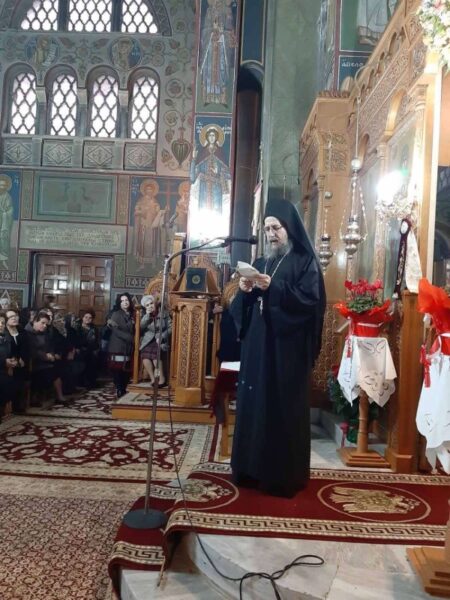 Ο Σεβ. Μητροπολίτης Λαρίσης και Τυρνάβου κ. Ιερώνυμος χοροστάτησε στον πανηγυρικό εσπερινό, αναφέρθηκε στη ζωή του τιμωμένου Αγίου και ευχαρίστησε τους Πατέρες που υπεβλήθησαν στον κόπο να έλθουν στην πόλη του Αγίου Αχιλλίου κομίζοντας αυτόν τον πνευματικό θησαυρό και παρεκάλεσε να μεταφέρουν τις ευγνώμονες ευχαριστίες της τοπικής μας Εκκλησίας στον Καθηγούμενο της Ιεράς Μονής Σίμωνος Πέτρας Αρχιμ. Ελισαίο και στην αδελφότητα του.