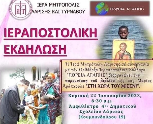 Η Ιερά Μητρόπολη Λαρίσης σε συνεργασία με τον Ορθόδοξο Ιεραποστολικό Σύλλογο ΠΟΡΕΙΑ ΑΓΑΠΗΣ διοργανώνει την παρουσίαση του βιβλίου της κ. Μαρίας Αράπκουλε «ΣΤΗ ΧΩΡΑ ΤΟΥ ΜΙΣΕΝΙ», την Κυριακή 22 Ιανουαρίου στις 6.30μμ., στο αμφιθέατρο 4ου Δημοτικού Σχολείου Λάρισας.