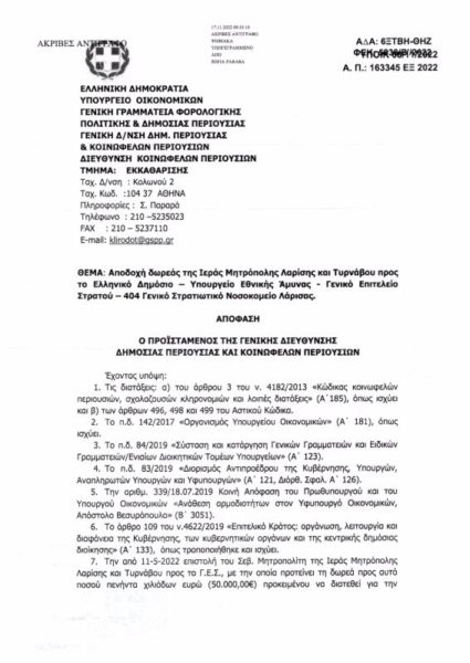Εγκρίθηκε η δωρεά της Ιεράς Μητροπόλεως Λαρίσης και Τυρνάβου προς το 404 Στρατιωτικό Νοσοκομείο της πόλης.