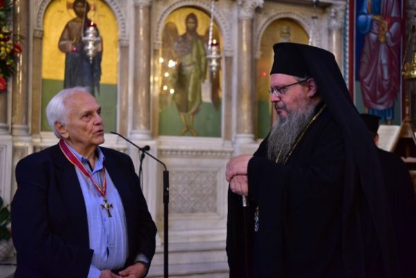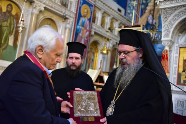 Πριν το πέρας της εκδηλώσεως, ο Ποιμενάρχης κ. Ιερώνυμος αφού πρωτίστως, επικαλέστηκε την ευλογία του Αγίου στη ζωή όλων των Λαρισαίων αδελφών, ευχαρίστησε τη χορωδία του κ. Διαμάντη για την άριστη απόδοση των ύμνων, αναφέρθηκε στο πρόσωπο του κ. Παπαθεοδώρου και στην προσφορά του στην τοπική μας Εκκλησία και κοινωνία, ενώ τον βράβευσε με τον Σταυρό της Μητροπόλεως μας και του επέδωσε ως ευλογία μία ασημένια εικόνα του Αγίου Αχιλλίου, τιμώντας τον και ευχαριστώντας τον για όσα καθημερινά προσφέρει στην Ιερά Μητρόπολη μας.