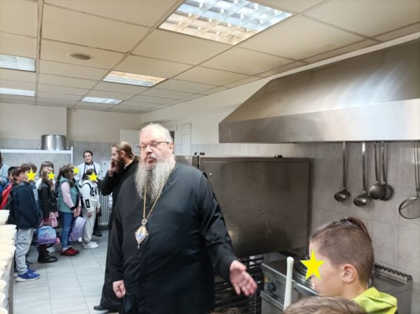 Τα παιδιά φιλοξενήθηκαν στους χώρους του Επιουσίου, όπου δέχτηκαν κεράσματα από τους Πατέρες της Ιεράς Μητρόπολης. Ο Σεβασμιώτατος ξενάγησε τους μαθητές στους χώρους που προετοιμάζονται και παρασκευάζονται τα συσσίτια.