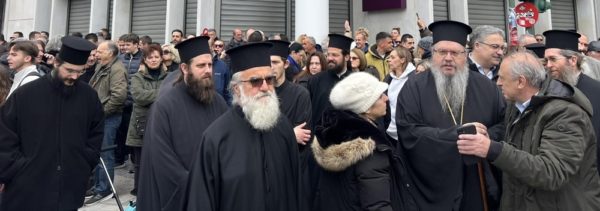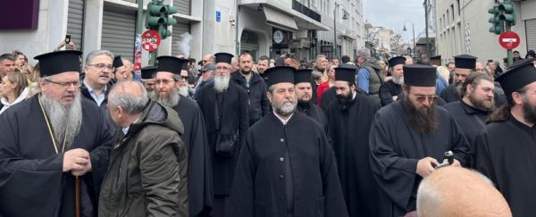 Ο Λαρίσης Ιερώνυμος με ιερείς στη συγκέντρωση για τα θύματα των Τεμπών