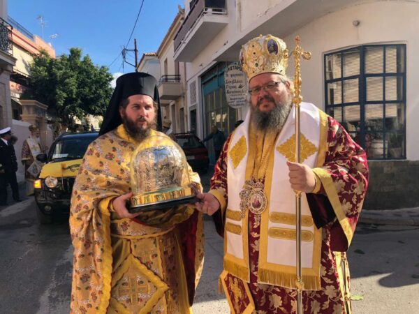 Ακολούθησε η μεγαλοπρεπής λιτανεία της Αγίας Κάρας του Αγίου Νεκταρίου στους δρόμους του ευλογημένου νησιού, όπου πλήθος κόσμου υπέμενε καρτερικά να περάσει ο Άγιος ενώπιον τους ώστε να λάβουν την ευλογία του, προπορευομένων των Μοναχικών Ταγμάτων του νησιού, με επικεφαλής την Καθηγουμένη Τιμοθέη μοναχή, η οποία με σοφία και σύνεση ηγείται της Αδελφότητος της.