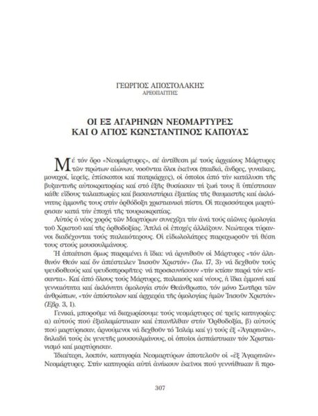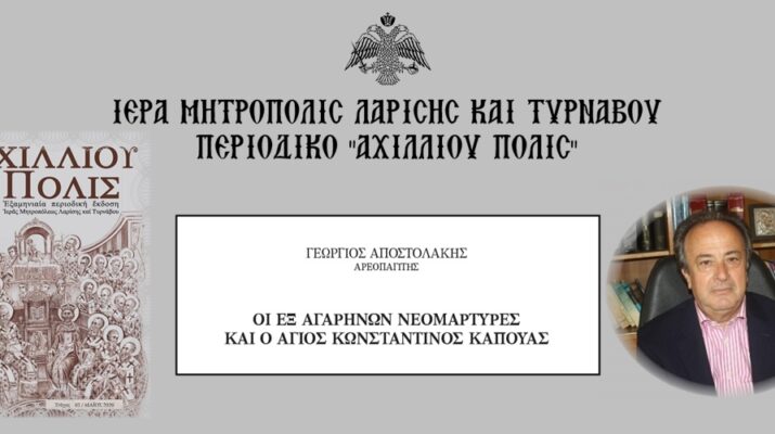 Άρθρο του κ. Γεωργίου Αποστολάκη, Αρεοπαγίτου, υπό το θέμα: “Οι Εξ Αγαρηνών Νεομάρτυρες Και Ο Άγιος Κωνσταντίνος Καπούας”, το οποίο δημοσιεύεται στο περιοδικό ΑΧΙΛΛΙΟΥ ΠΟΛΙΣ της Ιεράς Μητροπόλεως Λαρίσης και Τυρνάβου.