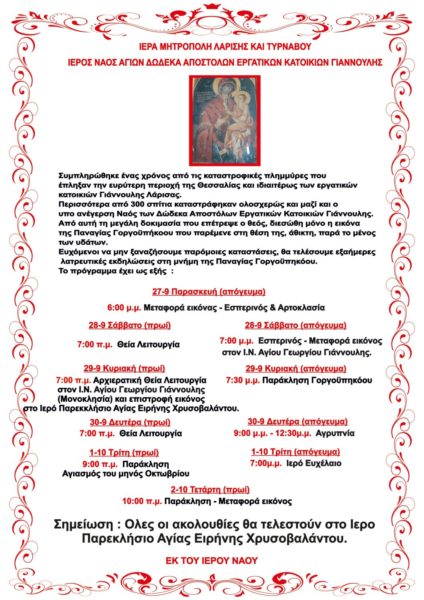 Οι Εργατικές Κατοικίες Γιάννουλης τιμούνε την Παναγία τη Γοργοϋπήκοο ένα χρόνο μετά τις πλημμύρες