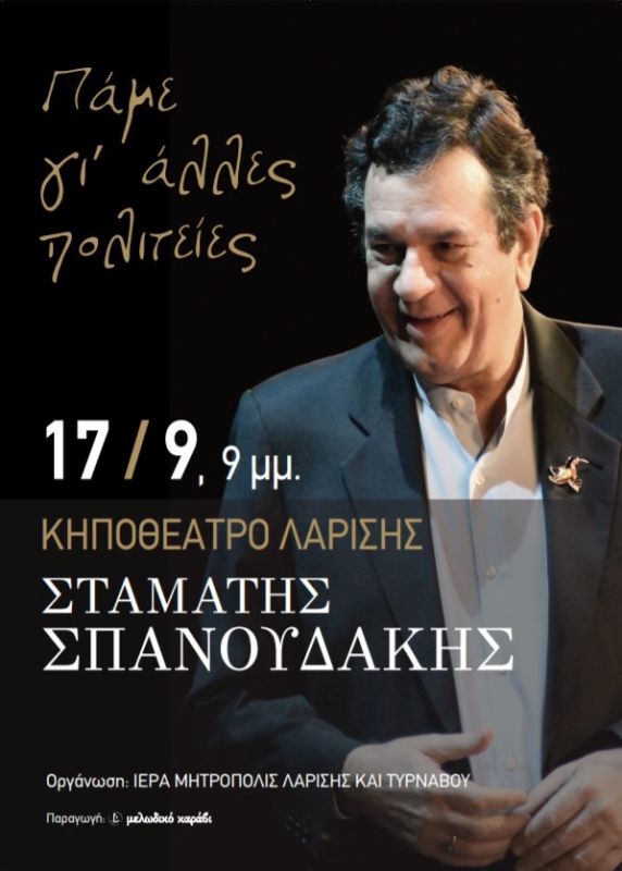 Στο Κηποθέατρο Λαρίσης, την Τρίτη 17 Σεπτεμβρίου 2019 και ώρα 21.00΄ μ.μ, η Ιερά Μητρόπολη Λαρίσης και Τυρνάβου, με την ευκαιρία της ενάρξεως της νέας ακαδημαϊκής και πνευματικής χρονιάς, και στα πλαίσια της φιλανθρωπικής και ποιμαντικής μέριμνας της, διοργανώνει μία συναυλία με έργα του παγκοσμίου εμβελείας Καλλιτέχνη κ. Σταμάτη Σπανουδάκη, ο οποίος θα παρουσιάσει το πρόγραμμα του με τίτλο: