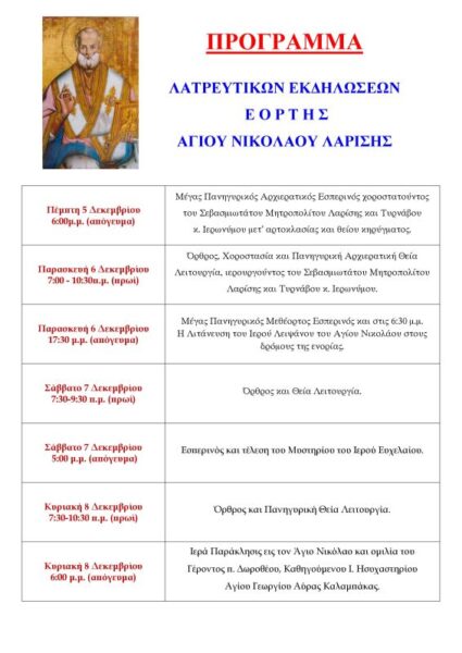 Παρασκευή 6 Δεκεμβρίου, 7:00 – 10:30 π.μ.: Όρθρος, Χοροστασία και Πανηγυρική Αρχιερατική Θεία Λειτουργία ιερουργούντος του Σεβασμιωτάτου Μητροπολίτου Λαρίσης και Τυρνάβου κ. Ιερωνύμου.