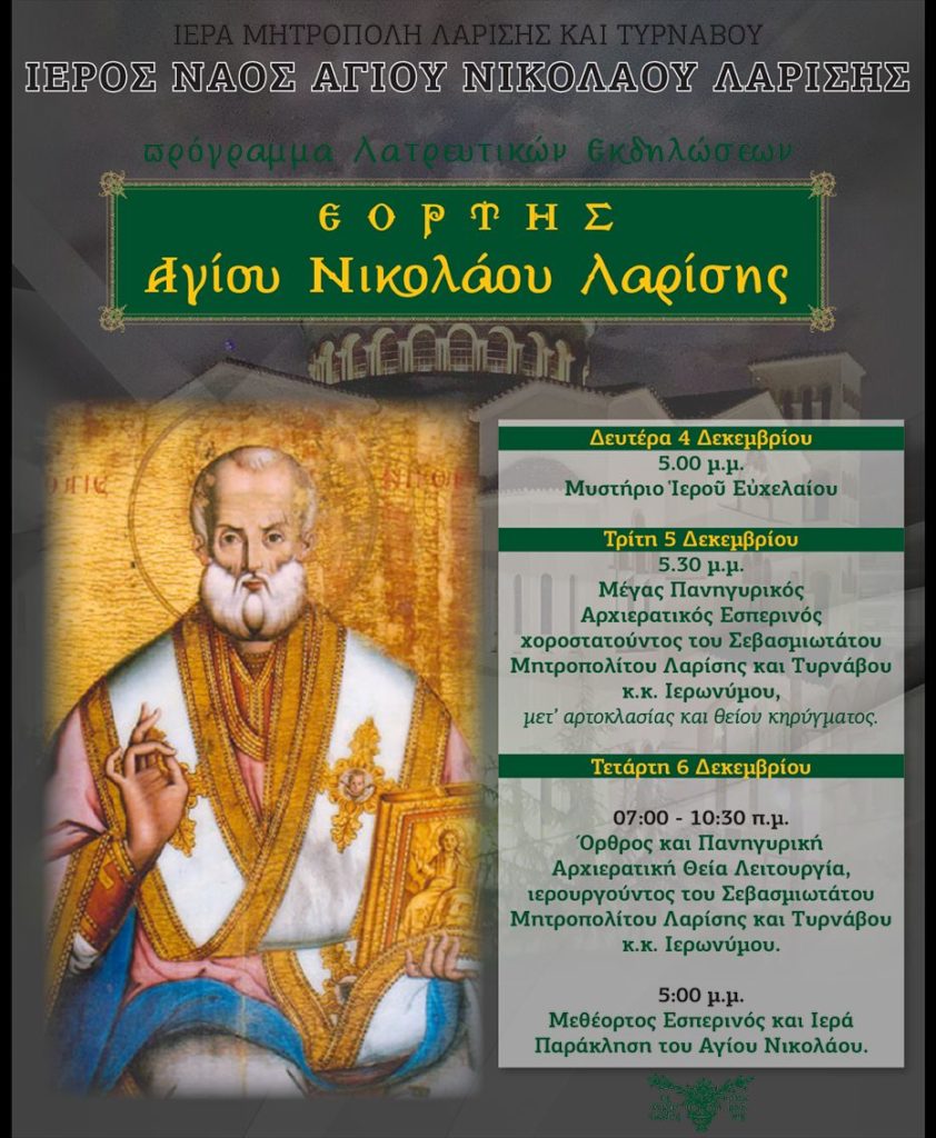 Τετάρτη 6 Δεκεμβρίου, 7:00 έως 10:30 π.μ.: Όρθρος και Πανηγυρική Αρχιερατική Θεία Λειτουργία, ιερουργούντος του Σεβ. Μητροπολίτου Λαρίσης και Τυρνάβου κ. Ιερωνύμου επί τη Εορτή του Αγίου Νικολάου.
