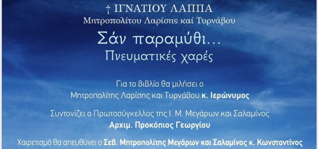 Είναι το τίτλος του βιβλίου που θα παρουσιαστεί στη Σαλαμίνα σε ένα Κυριακάτικο πρωινό, αφιερωμένο στον Μακαριστό Λαρίσης Ιγνάτιο.