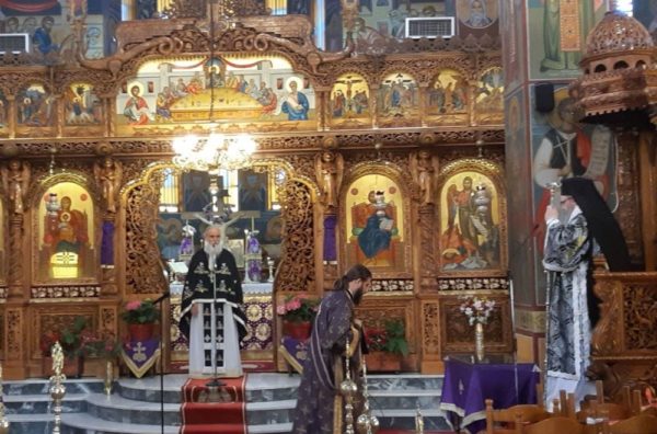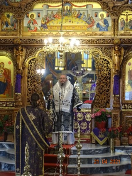 Στον Ιερό Ναό του Αγίου Μεγαλομάρτυρος Γεωργίου Λαρίσης τέλεσε την Προηγιασμένη Θεία Λειτουργία, σήμερα, Τετάρτη εσπέρας προ των Βαΐων, ο Σεβασμιώτατος Μητροπολίτης Λαρίσης και Τυρνάβου κ. Ιερώνυμος τηρουμένων των υγειονομικών μέτρων.