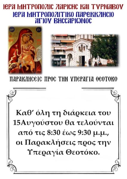 Στο Ιερό Μητροπολιτικό Παρεκκλήσιο του Αγίου Βησσαρίωνος της Ιεράς Μητροπόλεως Λαρίσης και Τυρνάβου, στην πλατεία Λαού, καθ’ όλη τη διάρκεια του Δεκαπενταυγούστου και τις ημέρες που η Αγία μας Εκκλησία έχει ορίσει να τελούνται Ιερές Παρακλήσεις προς τιμήν της Υπεραγίας Θεοτόκου, η Ακολουθία θα ξεκινάει στις 20:30 έως και 21:30.