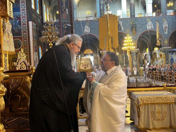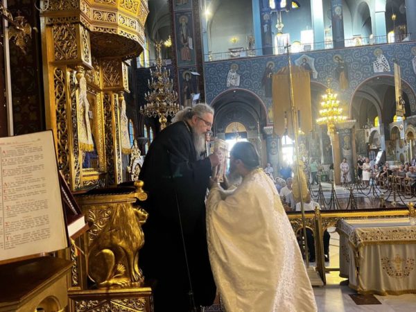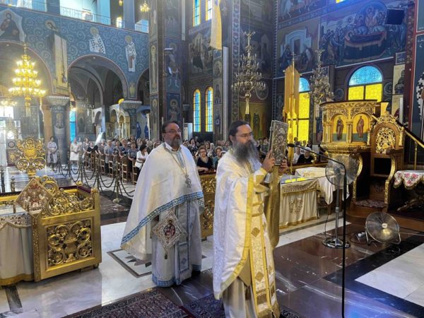 Παρά την αφόρητη ζέστη, πολλοί εκκλησιάστηκαν και γέμισαν τον Ναό, αποδεικνύοντας το φιλακόλουθο και φιλόχριστο πνεύμα των Λαρισαίων. Ο Σεβασμιώτατος στο κήρυγμα του αναφέρθηκε στην κίνηση του Χριστού να εξαναγκάσει τους μαθητές Του να μπουν στο πλοίο και να απομακρυνθούν από ανθρώπους που μπορεί να ευεργετήθηκαν από τον Χριστό μας, δεν είχαν όμως αγαθή διάθεση απέναντί Του θέλοντας να Τον εκμεταλλευθούν. Λαμβάνοντας αφορμή από τη βύθιση του Πέτρου που είχε ως αποτέλεσμα να τον μαλώσει ο Χριστός για ολιγοπιστία, τόνισε πως πολλές φορές θεωρούμε ότι η Εκκλησία βυθίζεται στη δίνη του κόσμου και προσπαθούμε να την «σώσουμε» ξεχνώντας πως η Εκκλησία σώζει εμάς κι όχι το αντίστροφο.