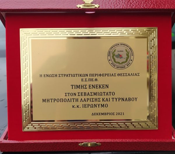 Η ΕΣΠΕΘ ευχαρίστησε το Σεβασμιώτατο Μητροπολίτη Λαρίσης και Τυρνάβου κ. Ιερώνυμο για την άμεση και ουσιαστική συνάντηση επιδίδοντας πλακέτα με το έμβλημα της Ένωσης και συνέβαλε από την πλευρά της με μια δωροεπιταγή, στο Θεάρεστο έργο της Μητροπόλεως, της παροχής συσσιτίου σε άπορες οικογένειες.