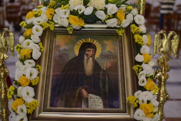 Τον Θείο Λόγο κατόπιν ευλογίας του Ποιμενάρχου, υπούργησε ο Πανοσιολογιώτατος Αρχιμανδρίτης κ. Άγγελος Ανθόπουλος, Πρωτοσύγκελος της Ιεράς Μητροπόλεως Φθιώτιδος, ο οποίος τόνισε την προσήλωση του Οσίου Ιερωνύμου στην αγιογραφική και την εν γένει παράδοση της Εκκλησίας ως βασικό χαρακτηριστικό της Θεολογίας και της προσφοράς του στην πατερική γραμματεία.