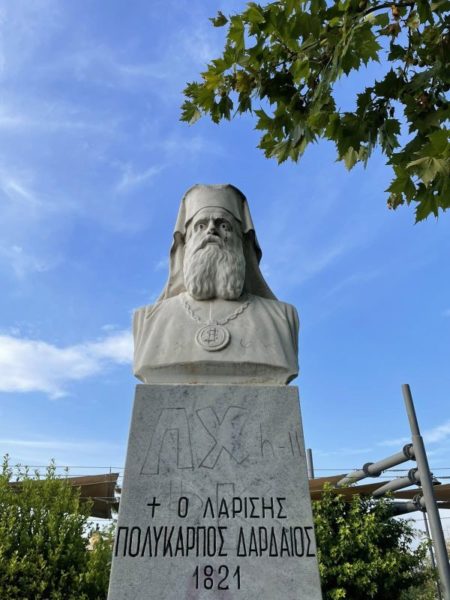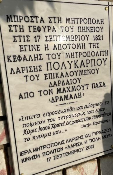Ο αοίδιμος Μητροπολίτης Λαρίσης Πολύκαρπος αποκεφαλίστηκε στις 17 Σεπτεμβρίου του 1821, μετά από εντολή του Μαχμούτ Πασά ή Δράμαλη, ως αντίποινο για τη στάση των Θεσσαλών στο Πήλιο και το Βελεστίνο.