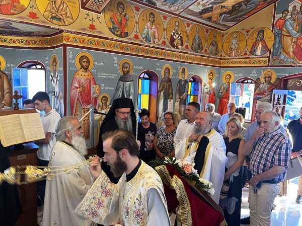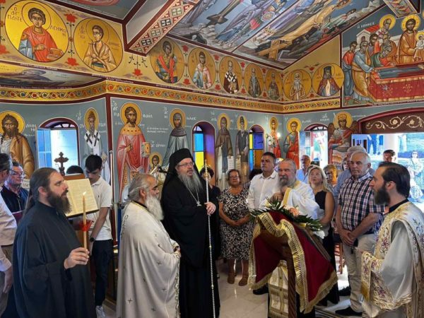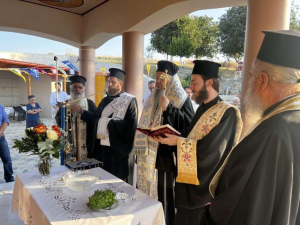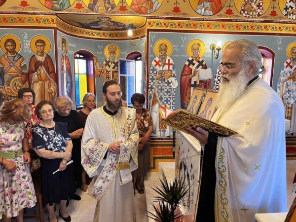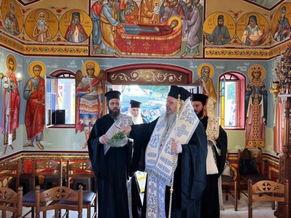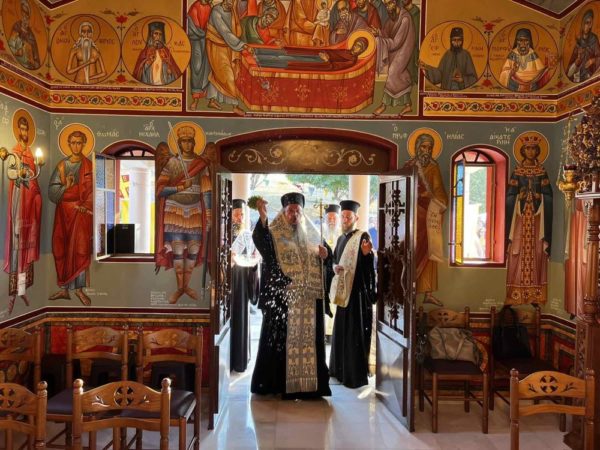 Ο Σεβασμιώτατος τέλεσε την Ακολουθία του Αγιασμού και των Θυρανοιξίων του νεόδμητου Ιερού Παρεκκλησίου και εν συνεχεία χοροστάτησε στον Εσπερινό και στην Ιερά Παράκληση προς την Υπεραγία Θεοτόκο.