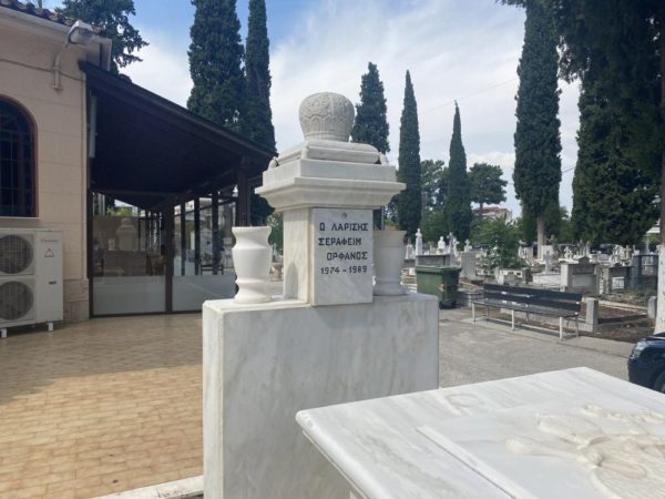 Ο μακαριστός κυρός Σεραφείμ αναπαύεται στο παλαιό Κοιμητήριο της πόλεως, όπισθεν του Ιερού Βήματος της ενορίας των Παμμεγίστων Ταξιαρχών, μαζί μετά των αοιδίμων Μητροπολιτών Λαρίσης κυρών Νεοφύτου Πετρίδη του από Φαρσάλων και Σερρών, Αρσενίου Αφεντούλη του από Στρωμνίτσης & Τιβεριουπόλεως, Δημητρίου Θεοδόση του από Γυθείου και Ιακώβου Σχίζα.Μ