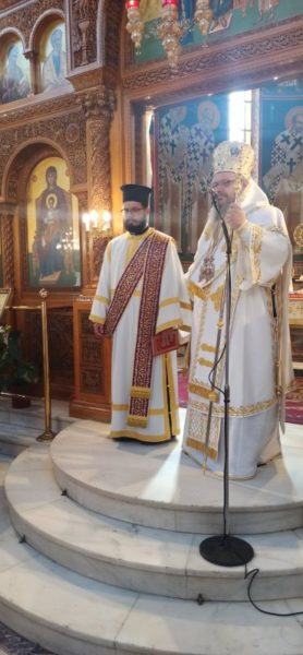 Στην προσλαλιά του προς τον χειροτονούμενο ο Σεβασμιώτατος αναφέρθηκε στην Παναγία μας η οποία συνέβαλε τα μέγιστα στο σχέδιο της Θείας Οικονομίας αφού από την οποία γεννήθηκε ο Χριστός, αλλά και στο Μυστήριο της Ιερωσύνης, από το οποίο προκύπτει το Σώμα και το Αίμα του Χριστού και όπως η Παναγία σάρκωσε το Λόγο του Θεού ίνα σωθή ο κόσμος δι’ αυτού, έτσι και η Ιερωσύνη προσφέρει το Σώμα και το Αίμα του Χριστού υπέρ της του κόσμου Ζωής και Σωτηρίας. Επίσης ο Σεβασμιώτατος αναφέρθηκε στην προσωπική του γνωριμία με την οικογένεια του νεοχειροτονουμένου, τον οποίο γνωρίζει από την ηλικία των επτά ετών και χαίρεται διότι από ένα τέτοιο πνευματικό οικογενειακό περιβάλλον ανεδείχθη ένας διάκονος του πυρίφλεκτου θυσιαστηρίου.