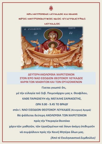 Με την ευλογία του Σεβασμιωτάτου Μητροπολίτου Λευκάδος και Ιθάκης κ. Θεοφίλου, κάθε Παρασκευή της Μεγάλης Τεσσαρακοστής μεταξύ 9.00 και 9.45 το βράδυ στον Ιερό Ναό Εισοδίων της Θεοτόκου Λευκάδος (Κεντρική Αγορά) θα ψάλλεται δεύτερη ακολουθία των Χαιρετισμών προς την Υπεραγία Θεοτόκο χάριν των μαθητών, των εργαζομένων και όσων ακόμη επιθυμούν να συμψάλουν προς την Κοινή Μητέρα όλων μας.