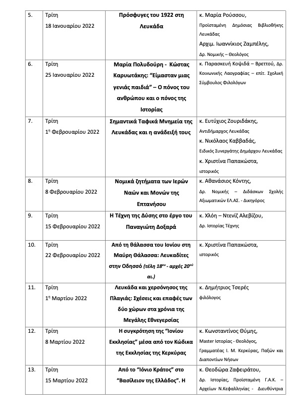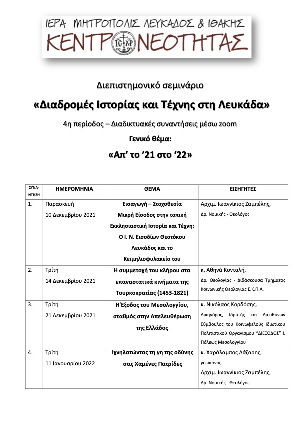 Για τέταρτη συνεχή χρονιά, η Μητρόπολη Λευκάδος και Ιθάκης διοργανώνει το διεπιστημονικό σεμινάριο, με τίτλο: «Διαδρομές Ιστορίας και Τέχνης στη Λευκάδα», προσκαλώντας εκπαιδευτικούς, φοιτητές, μαθητές, νέους επιστήμονες, κληρικούς και γενικά κάθε ενδιαφερόμενο να συμμετάσχουν σε αυτό. Θα αρχίσει την Παρασκευή 10 Δεκεμβρίου 2021 και θα ολοκληρωθεί Σάββατο 2 Απριλίου 2022.
