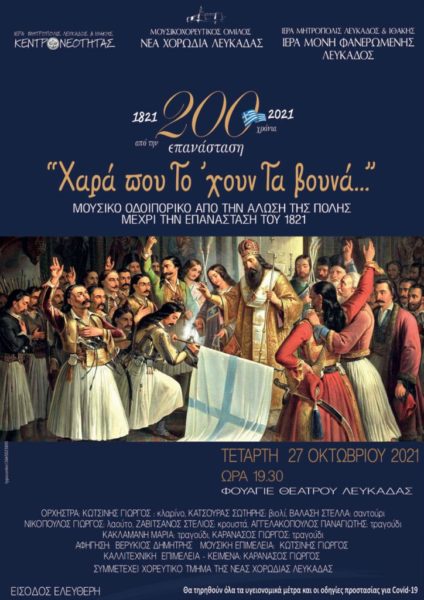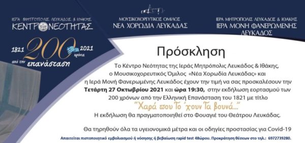 Το Κέντρο Νεότητας της Ιεράς Μητρόπολης Λευκάδος & Ιθάκης, ο Μουσικοχορευτικός Όμιλος «Νέα Χορωδία Λευκάδας» και η Ιερά Μονή Φανερωμένης Λευκάδος διοργανώνουν εκδήλωση εορτασμού των 200 χρόνων από την Ελληνική Επανάσταση του 1821 με τίτλο: «Χαρά που το ‘χουν τα βουνά…». Η εκδήλωση θα πραγματοποιηθεί την Τετάρτη 27 Οκτωβρίου 2021 και ώρα 19:30 στο Φουαγιέ του Θεάτρου Λευκάδας.