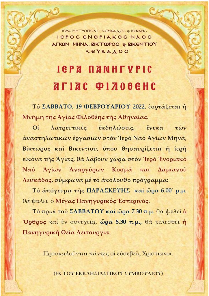 Κατά την εορτή της Αγίας Φιλοθέης, οι λατρευτικές εκδηλώσεις, ένεκα των αναστηλωτικών έργασιών στον Ιερό Ναό Αγίων Μηνά, Βίκτωρος και Βικεντίου, όπου θησαυρίζεται η ιερή εικόνα της Αγίας, θα λάβουν χώρα στον Ιερό Ενοριακό Ναό Αγίων Αναργύρων Κοσμά και Δαμιανού Λευκάδος.