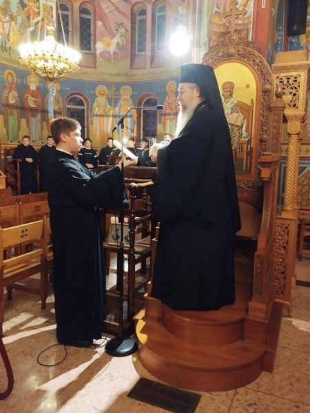Μετά το πέρας του Αρχιερατικού Εσπερινού, ο Σεβασμιώτατος Μητροπολίτης ξεναγήθηκε στους χώρους της Ιστορικής Εκκλησιαστικής Σχολής από τον Πανοσιολογιώτατο π. Άνθιμο, υπεύθυνο του Ιερού Ναού της Σχολής, τον Διευθυντή κ. Νικόλαο Γιαννή, τον κ. Γεώργιο Ζήσιμο, καθηγητή Βυζαντινής Μουσικης, τους καθηγητές Αντρέα Βαρβιτσιώτη και Γεώργιο Φωκά και τον επιμελητή κ. Γεώργιο Κομνηνό.