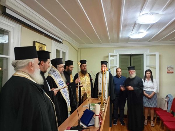 Στη συνέχεια ο Σεβασμιώτατος επέδωσε στην κα Ευαγγελία Γκουτζουρέλα το πτυχίο της, το οποίο έλαβε κατόπιν των εαρινών απολυτηρίων εξετάσεων με το βαθμό Άριστα. Πρόκειται για την πρώτη γυναίκα που λαμβάνει πτυχίο από τη Σχολή.