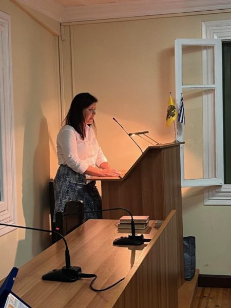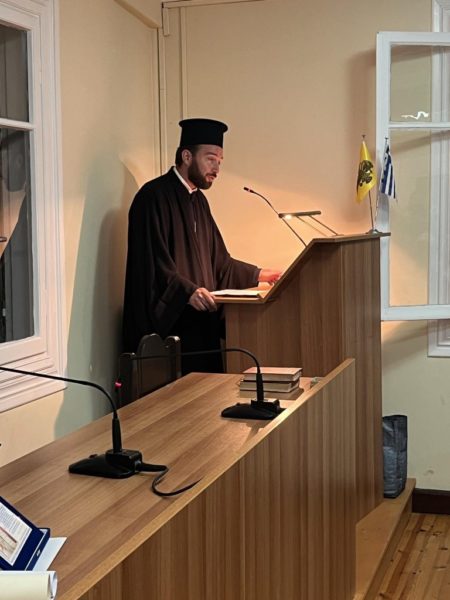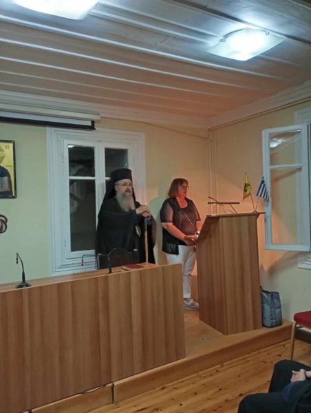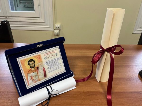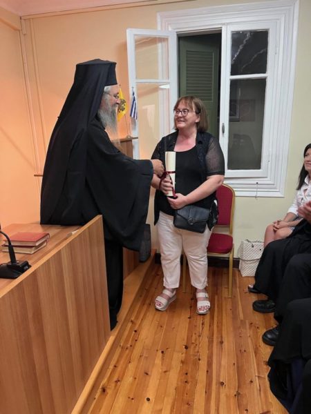 Στη συνέχεια ο Σεβασμιώτατος επέδωσε στην κα Ευαγγελία Γκουτζουρέλα το πτυχίο της, το οποίο έλαβε κατόπιν των εαρινών απολυτηρίων εξετάσεων με το βαθμό Άριστα. Πρόκειται για την πρώτη γυναίκα που λαμβάνει πτυχίο από τη Σχολή.