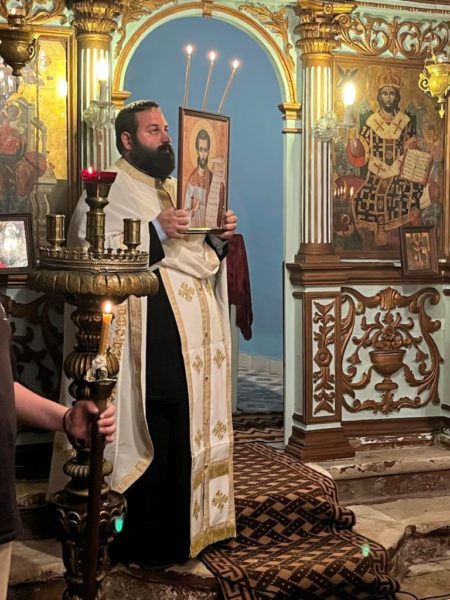 Του καθιερωμένου Αγιασμού προηγήθηκε ο Εσπερινός της εορτής του προστάτου Αγίου της Σχολής, Αγίου Ρωμανού του Μελωδού, η μνήμη του οποίου τιμάται την 1η Οκτωβρίου. Στον Εσπερινό χοροστάτησε ο Σεβασμιώτατος Μητροπολίτης Λευκάδος και Ιθάκης κ. Θεόφιλος, πλαισιωμένος από Ιερείς της Μητροπόλεως, παρουσία των μαθητών της Σχολής. Το Ιερό Αναλόγιο διηύθυνε ο Αιδεσιμολογιώτατος Οικονόμος π. Βασίλειος Κακλαμάνης, επικεφαλής χορού μαθητών της Σχολής.