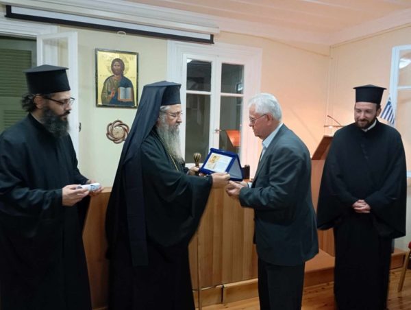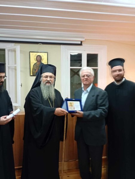 Στη συνέχεια, κατά πάγια απόφαση του Διοικητικού Συμβουλίου της Σχολής και μετά από την ομόφωνα αποδεκτή πρόταση τους Σεβασμιωτάτου, τιμήθηκε με αναμνηστική πλακέτα και τιμητικό δίπλωμα ο ιεροψάλτης της Ενορίας Κοιμήσεως Θεοτόκου Καλαμιτσίου, κ. Παναγιώτης Μακρυγιώργος. Για τον άμεσο συνεργάτη του μίλησε ο Εφημέριος της Ενορίας, Αιδεσιμολογιώτατος Πρεσβύτερος π. Βασίλειος Αρβανίτης, ενώ ο τιμώμενος αναφέρθηκε με καρδιακό και συγκινητικό λόγο στην αγάπη με την οποία προσφέρει την διακονία του τόσο στην Ενορία όσο και στην κοινωνία.