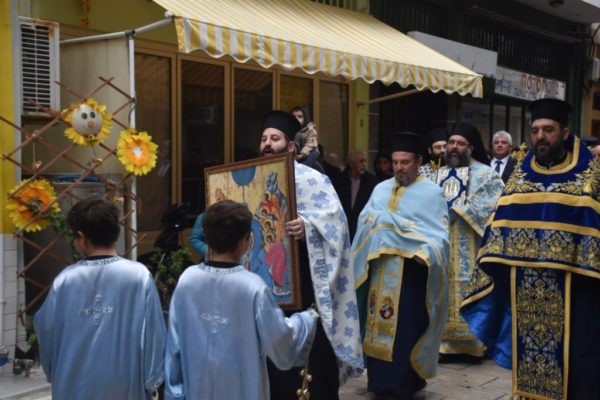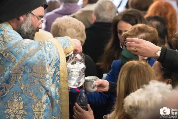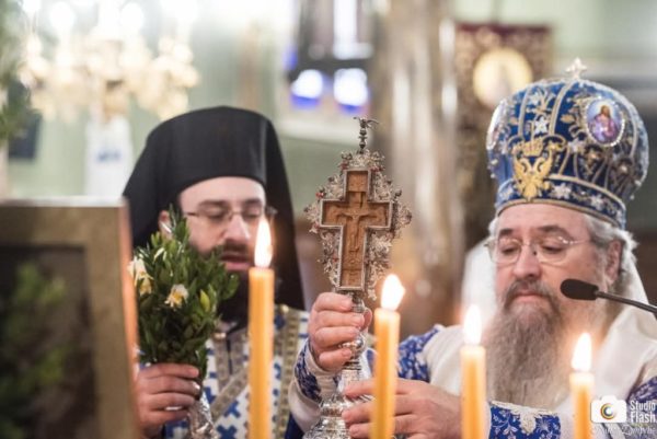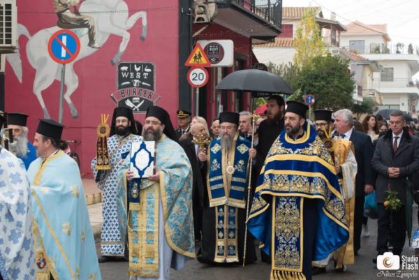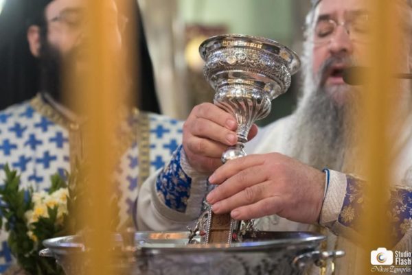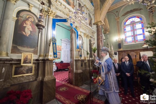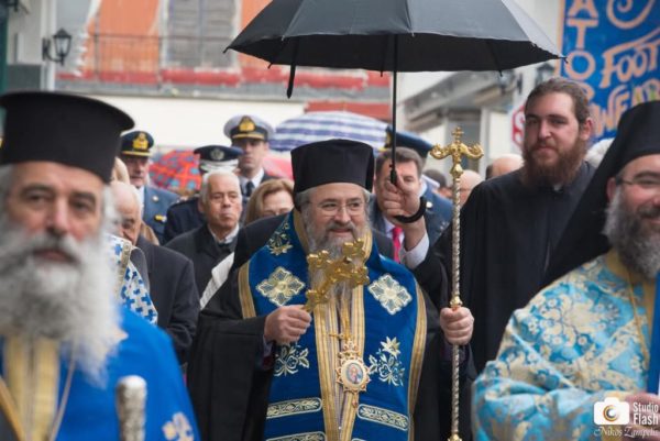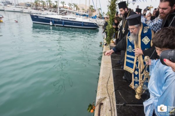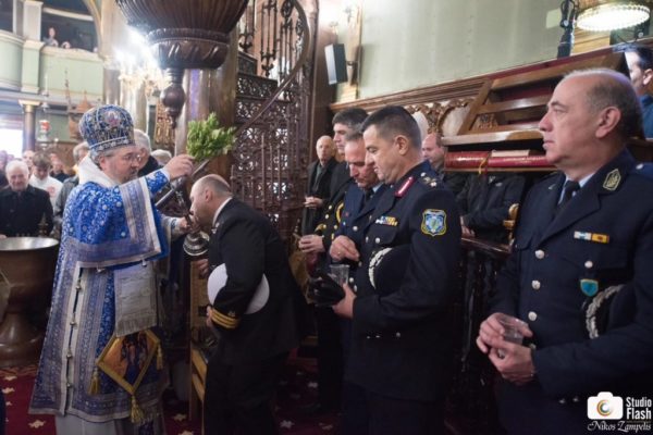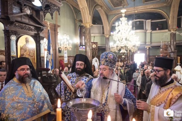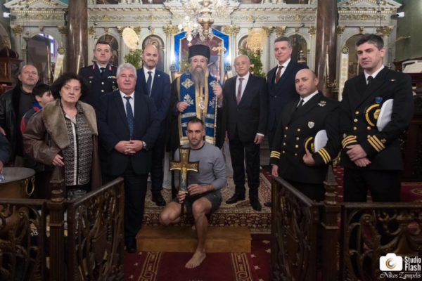 Στη συνέχεια και ώρα 10:45 π.μ. εψάλη υπό του Σεβασμιωτάτου Μητροπολίτου η Ακολουθία του Μεγάλου Αγιασμού, παρουσία των πολιτικών και στρατιωτικών αρχών του τόπου, μετά το πέρας της οποίας ακολούθησε Λιτανευτική Πομπή με τη συνοδεία του κλήρου, του ευσεβούς λαού και της Φιλαρμονικής για το λιμάνι της πόλεως όπου και πραγματοποιήθηκε η Τελετή κατάδυσης του Τιμίου Σταυρού. Αρκετά ήταν και φέτος τα άτομα που αψήφησαν το κρύο και βούτηξαν στη θάλασσα για να ανασύρουν το Σταυρό. Ο Σεβασμιώτατος Ποιμενάρχης προσέφερε από μια Καινή Διαθήκη και διάφορες άλλες ευλογίες σε όλους όσους έπεσαν στα κρύα νερά και επιπλέον από έναν επιστήθιο Σταυρό στους τρεις πρώτους τολμηρούς συμπολίτες του.