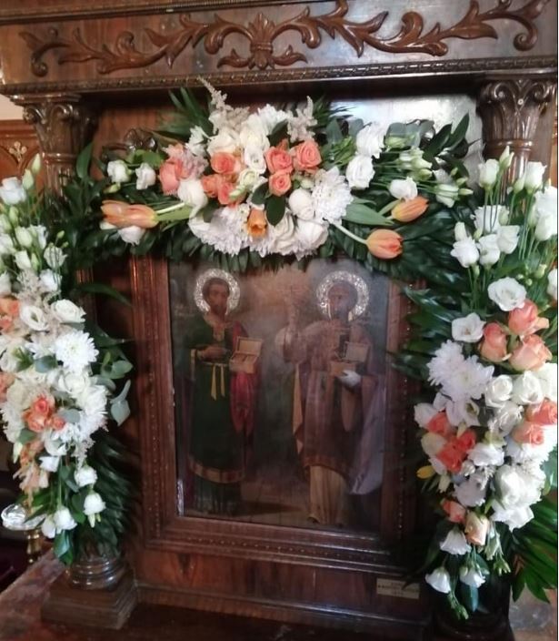 Σήμερα το πρωί (Κυριακής, 1 Νοεμβρίου) τελέσθηκε Πανηγυρική Θεία Λειτουργία μετ᾽ αρτοκλασίας, ιερουργούντων του Πανοσιολ. Αρχιμανδρίτου π. Σπυρίδωνος Μπούρη, ο οποίος και κήρυξε τον θείο λόγο, του εφημερίου του εν λόγω Ιερού Ναού, Αιδεσιμ. Πρεσβυτέρου π. Γρηγορίου Τσαβαλά και του ευλαβεστάτου Διακόνου, π. Νικολάου Κοντοπρία. Το απόγευμα της ίδιας ημέρας και ώρα 5.00 μ.μ. τελέσθηκε το Μυστήριο του Ιερού Ευχελαίου.