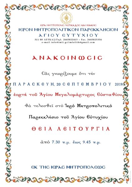 ΙΕΡΑ ΜΗΤΡΟΠΟΛΗ ΛΕΥΚΑΔΟΣ ΚΑΙ ΙΘΑΚΗΣ – Τήν ΠΑΡΑΣΚΕΥΗ, 20 ΣΕΠΤΕΜΒΡΙΟΥ 2019, ἑορτή τοῦ Ἁγίου Μεγαλομάρτυρος Εὐσταθίου, θά τελεσθεῖ στό Ἱερό Μητροπολιτικό Παρεκκλήσιο τοῦ Ἁγίου Εὐτυχίου, Θεία Λειτουργία, ἀπό 7.30 π.μ. ἔως 9.45 π.μ.