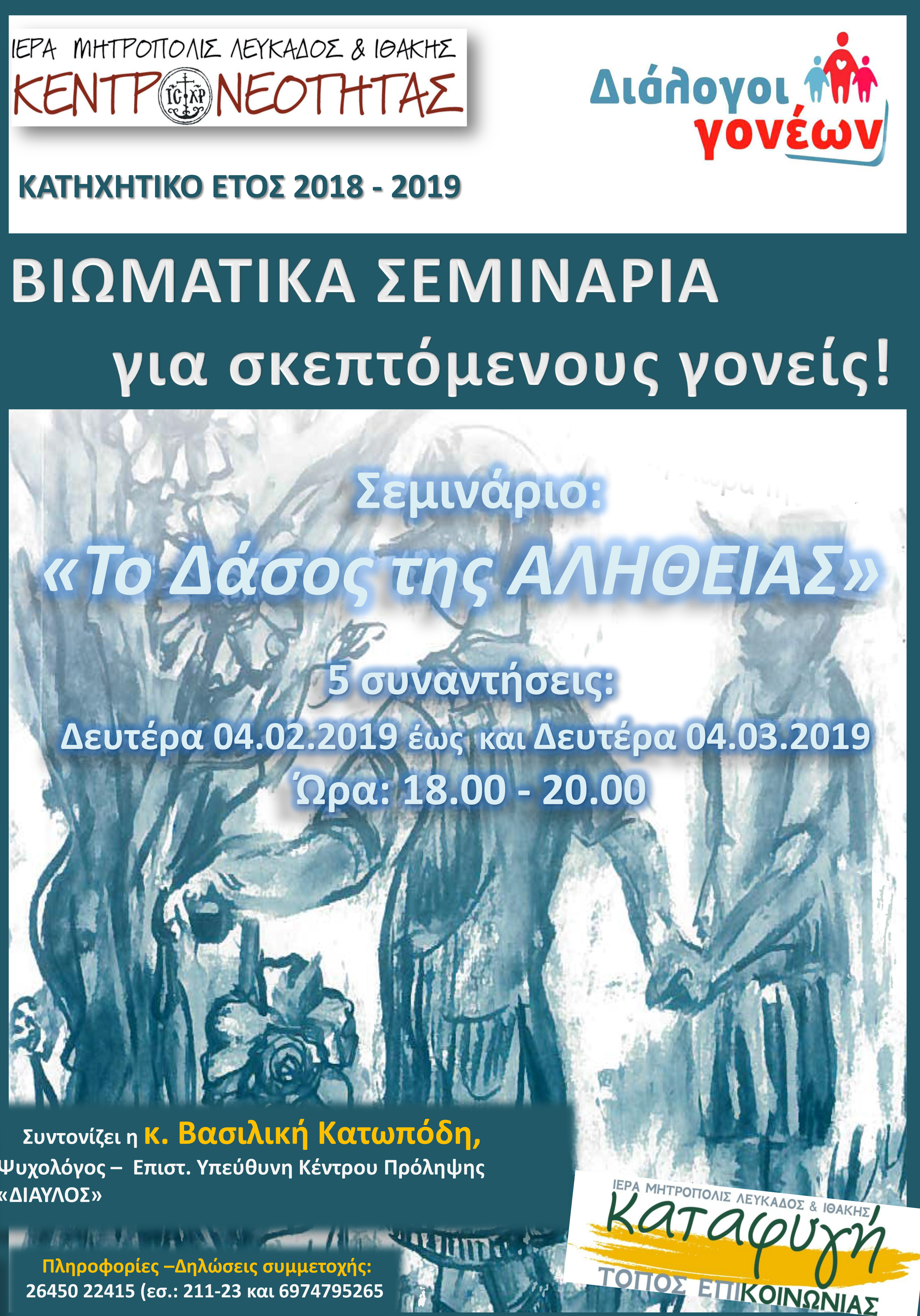 Οι «Διάλογοι Γονέων» συνεχίζονται στην τοπική μας εκκλησία με τη νέα τους μορφή, με δύο βιωματικά σεμινάρια για γονείς: Το πρώτο, με θέμα: «Το Δάσος της ΑΛΗΘΕΙΑΣ», θα διεξάγεται στην πόλη της Λευκάδας και συγκεκριμένα στην «Καταφυγή» (οδ. Μεγανησίου 5, κοντά στην Κεντρική Πλατεία) κάθε Δευτέρα, ώρα 18.00 – 20.00. Αρχίζει την ερχόμενη Δευτέρα 4 Φεβρουαρίου 2019 και περιλαμβάνει συνολικά πέντε δίωρες συναντήσεις μέχρι τις 4 Μαρτίου .