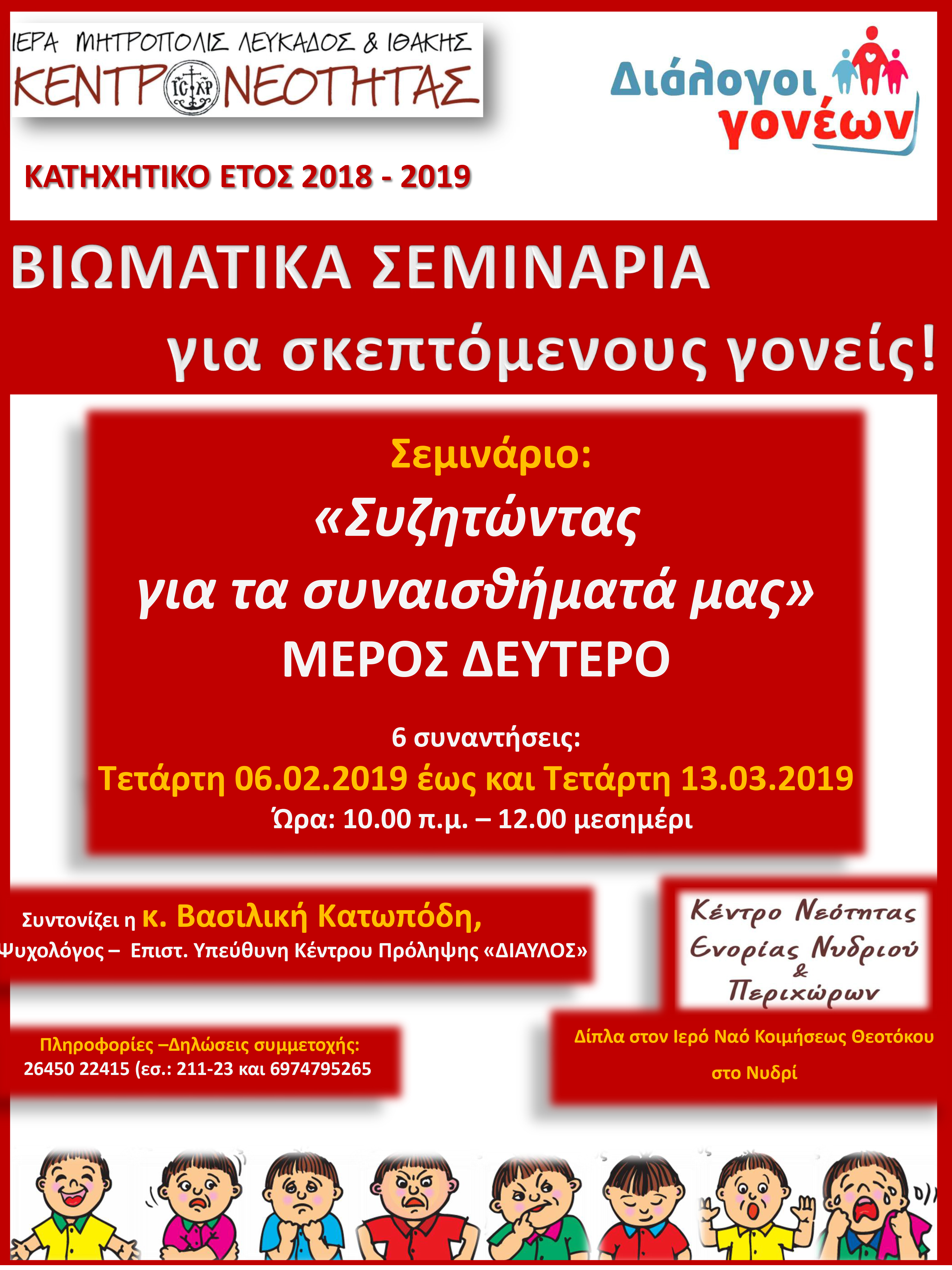 Το δεύτερο, με θέμα: «Συζητώντας για τα συναισθήματά μας – μέρος δεύτερο», θα διεξάγεται στο Κέντρο Νεότητας ενορίας Νυδριού και περιχώρων (δίπλα στον Ιερό Ναό Κοιμήσεως της Θεοτόκου, στο Νυδρί) κάθε Τετάρτη πρωί, ώρα 10.00 – 12.00. Αρχίζει την ερχόμενη Τετάρτη 6 Φεβρουαρίου 2019 και περιλαμβάνει συνολικά έξι δίωρες συναντήσεις μέχρι τις 13 Μαρτίου .