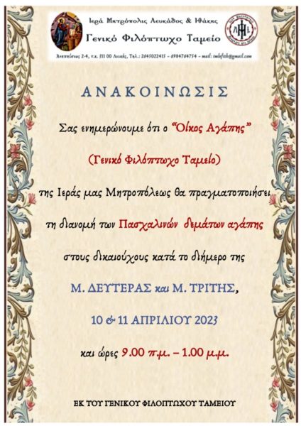 Το Φιλόπτωχο Ταμείο της Μητρόπολης Λευκάδος περί της διανομής Πασχαλινών δεμάτων αγάπης