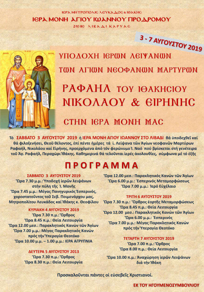 Η υποδοχή των ιερών λειψάνων θα πραγματοποιηθεί στην πύλη της Ιεράς Μονής το απόγευμα του Σαββάτου 3 Αυγούστου 2019 και ώρα 7.30 μ.μ. από τον Ιερό Κλήρο και τον ευσεβή Λαό, με επικεφαλής τον Σεβασμιώτατο Ποιμενάρχη μας, Μητροπολίτη Λευκάδος και Ιθάκης κύριο κ. Θεόφιλο. Θα ακολουθήσει ο Μέγας Πανηγυρικός Ἑσπερινός.
