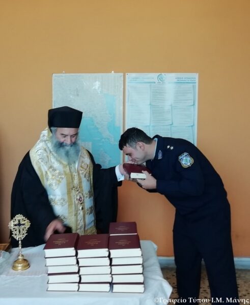 Απευθυνόμενος προς τους παρισταμένους, ο Σεβ. Ποιμενάρχης, μίλησε για την αξία της έννοιας της ασφάλειας και της δημόσιας τάξης, ενώ παράλληλα τους πρόσφερε ένα τόμο Αγίας Γραφής, τον οποίο μετά μεγάλης χαράς αποδέχθηκαν όλοι.